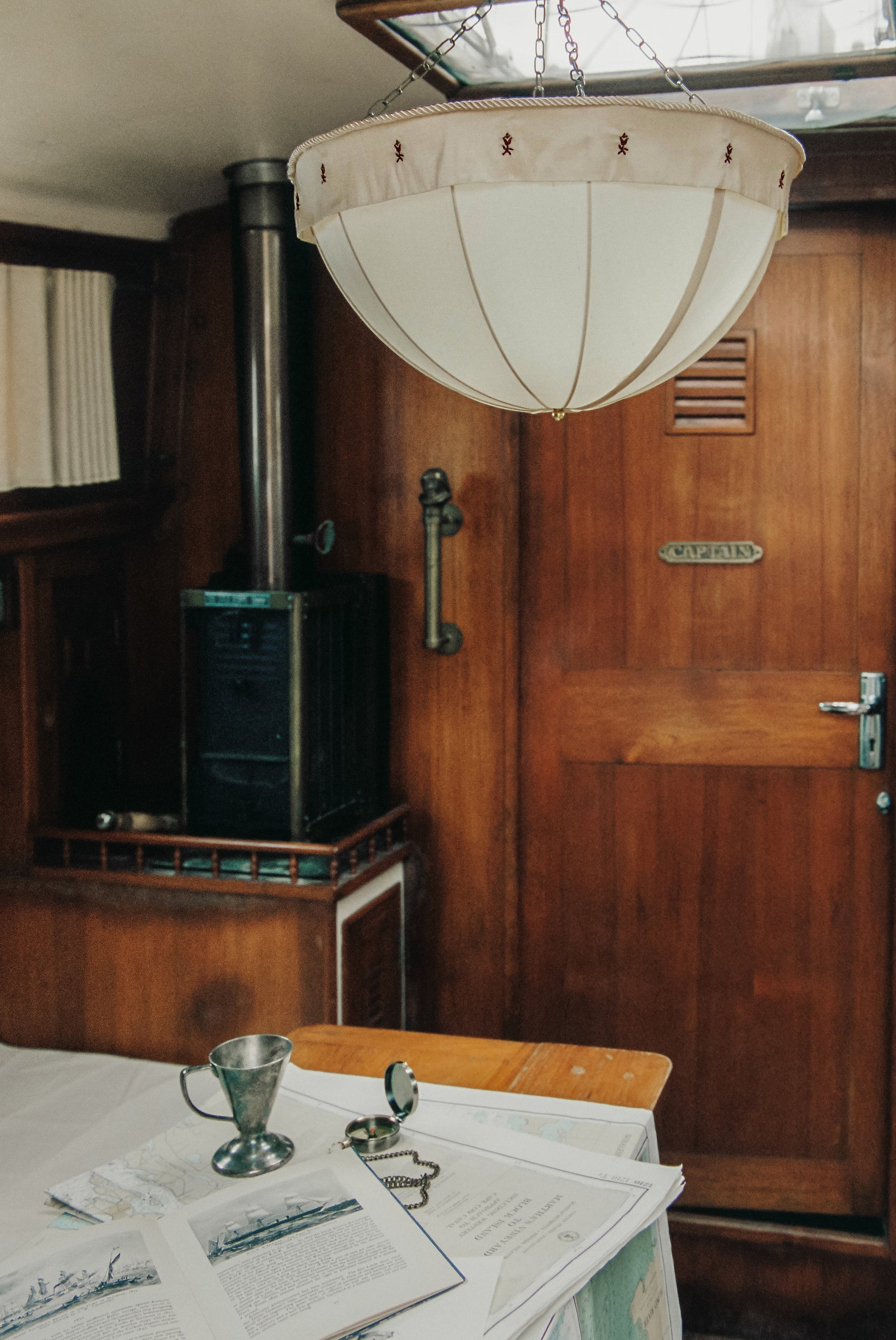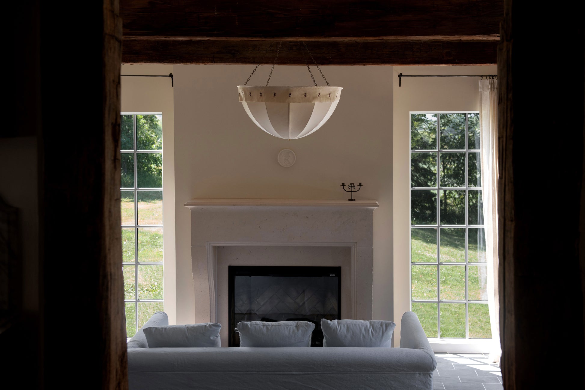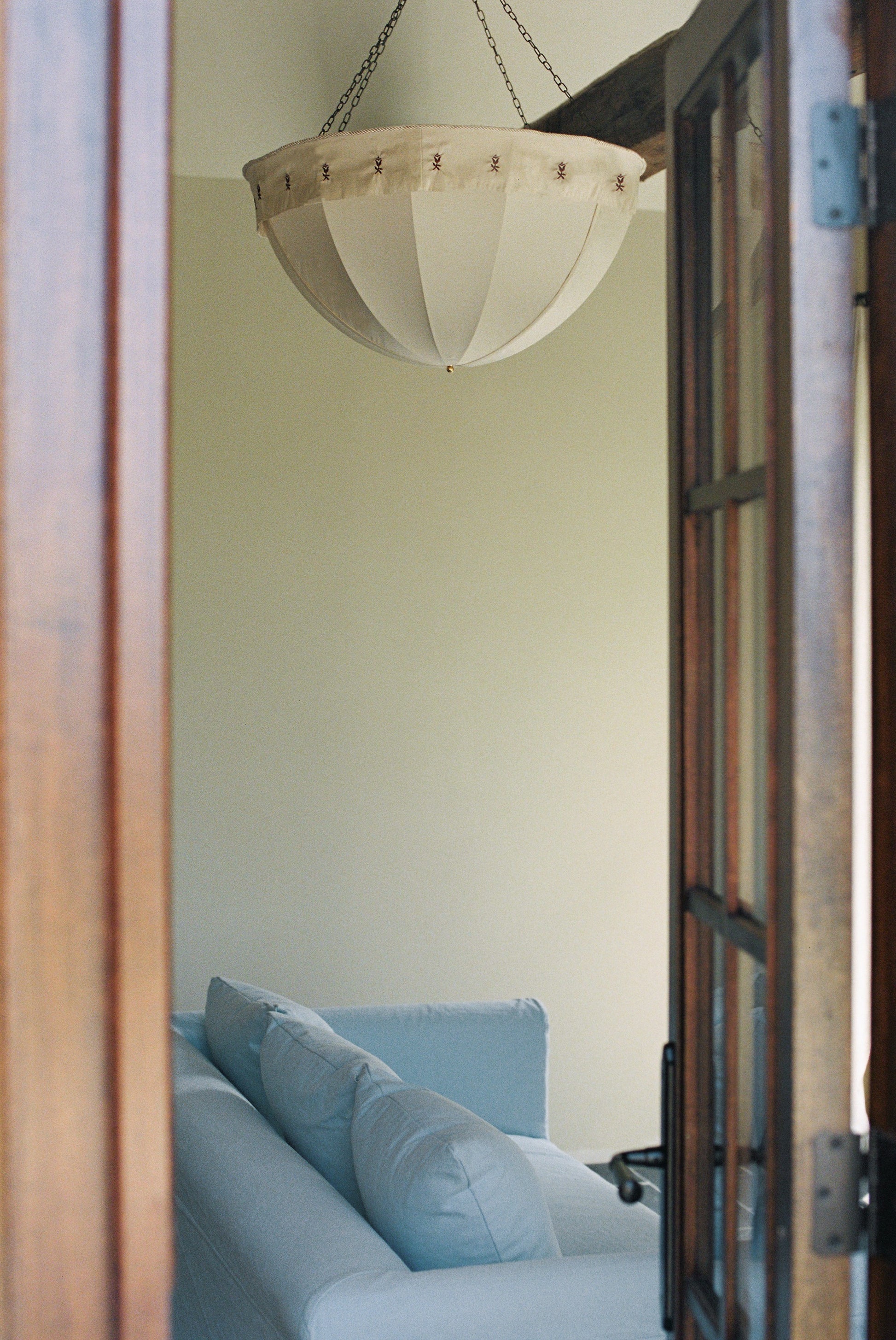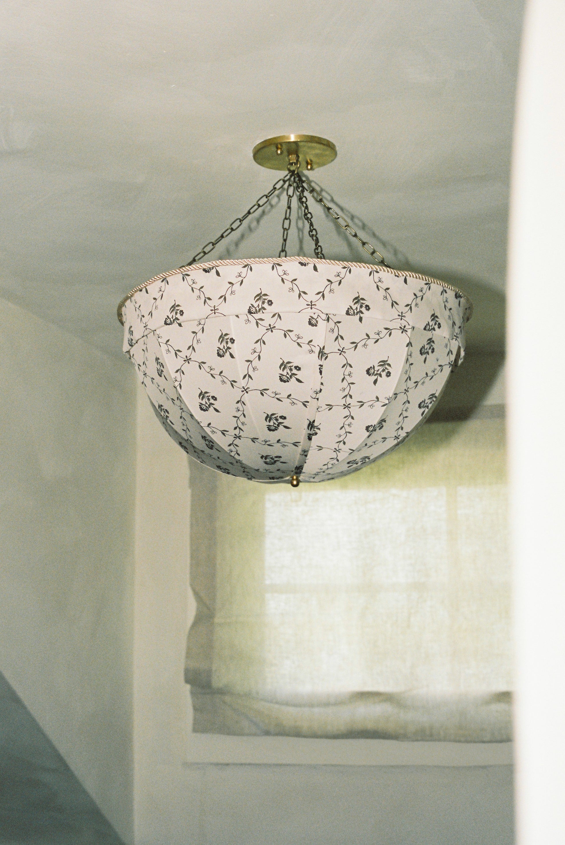 There’s a quiet ceremony to Estelle - a pendant that feels both timeless and folkloric, suspended like a linen banner in a summer hall. Its silk panels are edged with twisted corded piping and finished with an unfinished brass chain and finial. Two variations tell their own story: Huey’s original floral vine motif, drawn with the rhythm of a garden in bloom, or embroidered patterns that echo midsummer revels and Swedish folk art -talismans of light, luck, and ritual. Estelle’s glow is gentle and atmospheric, more memory than brightness, evoking long evenings, handwoven details, and the beauty of deliberate craft.