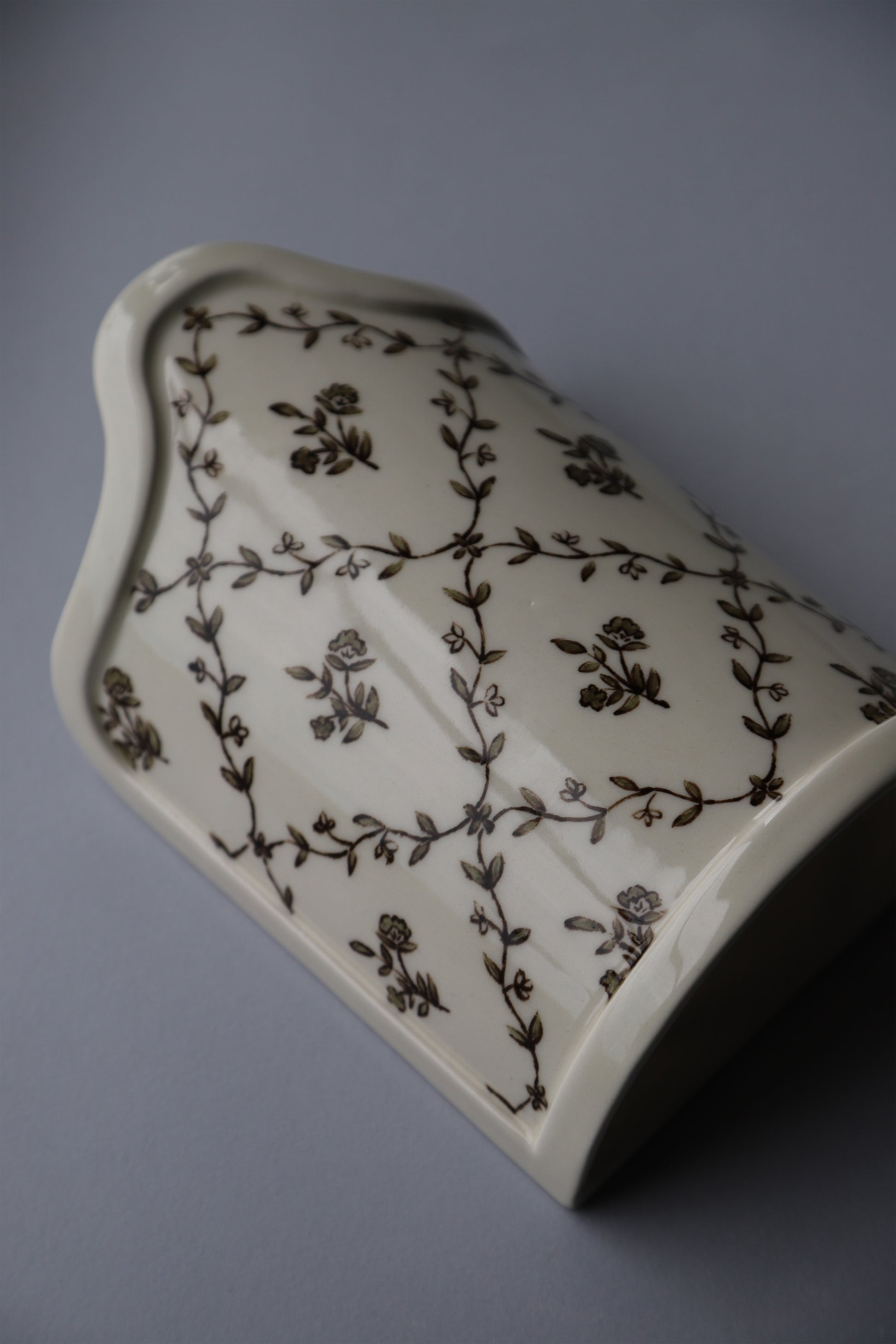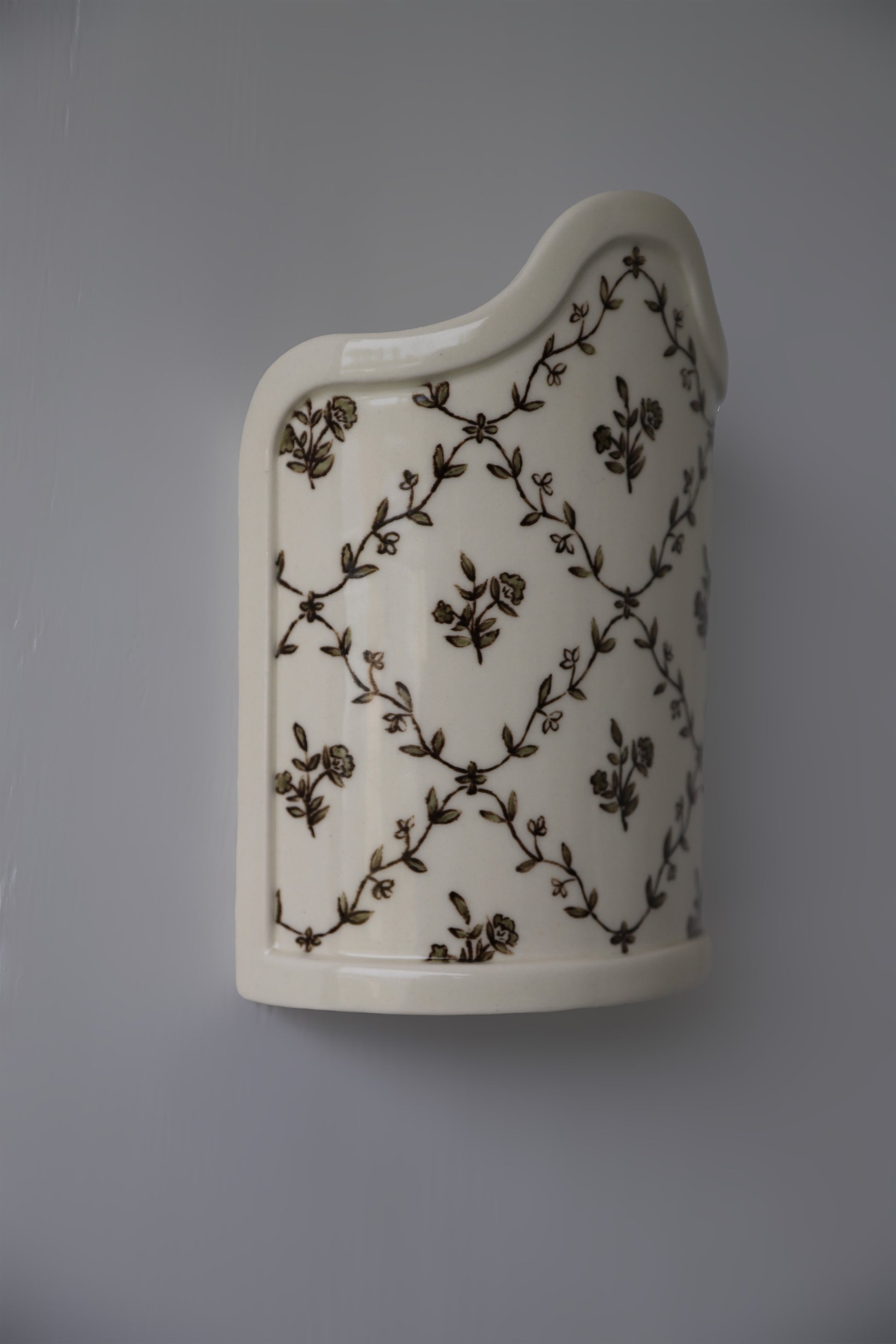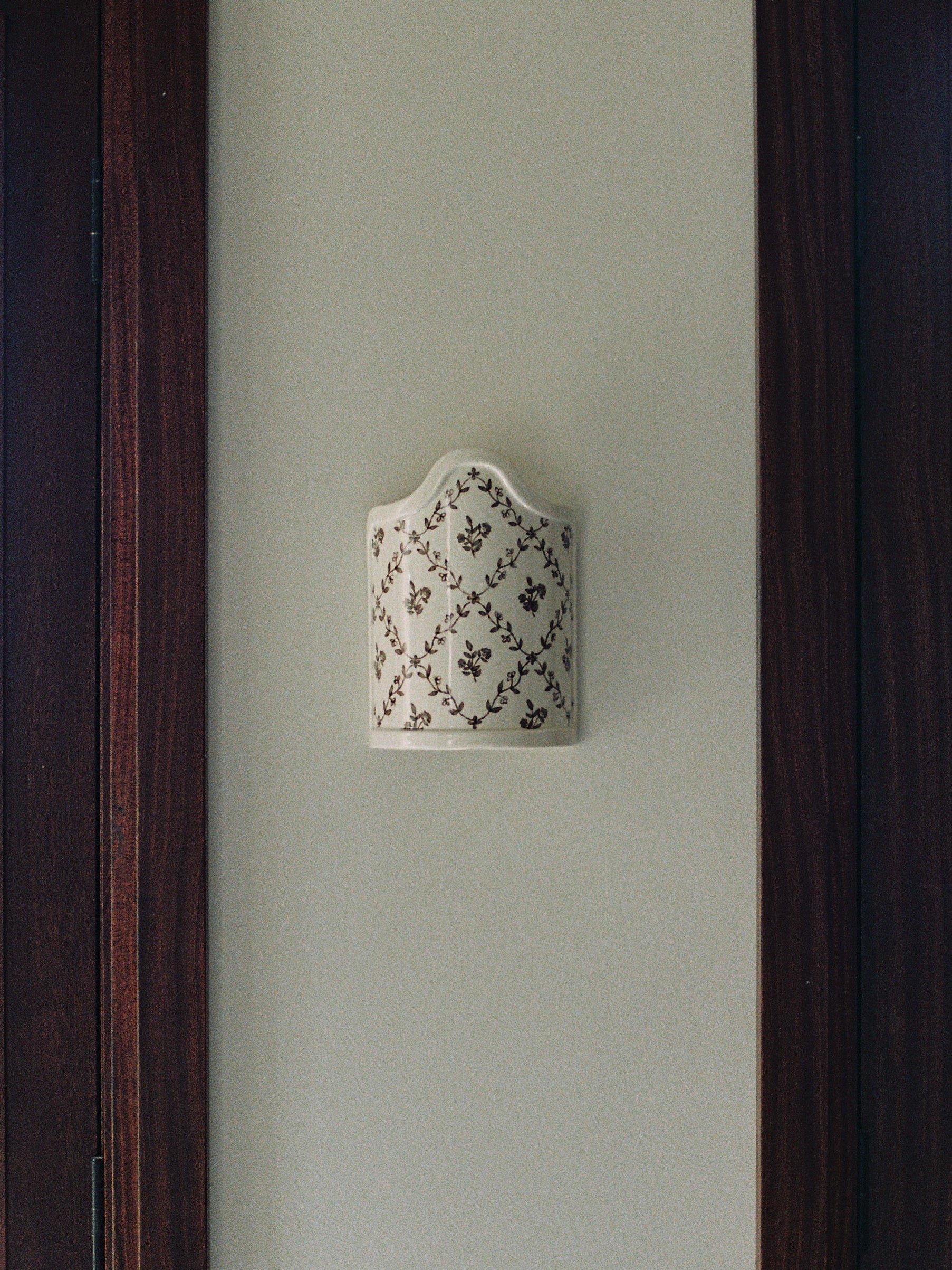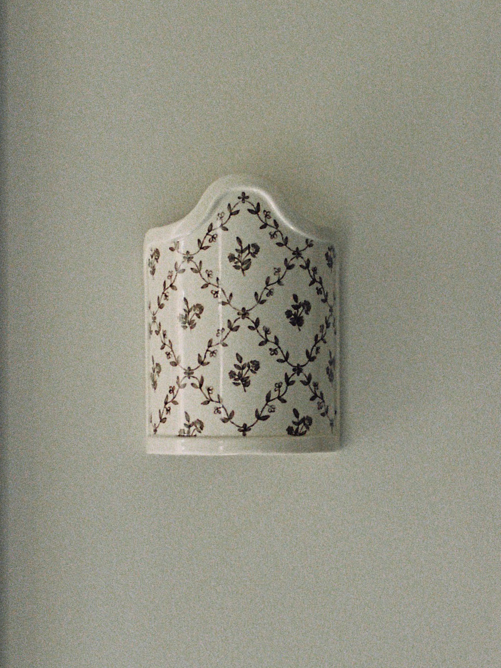 Tucked along the winding approach to an English manor, the Windermere sconce comes into view. Made from porcelain and hand-painted by local Ontario artist, Deborah Masters. It's surface recalls ivy-choked walls, the damp perfume of moss after rain, and the slow hush of dusk across the garden. Within, the light burns with the intimacy of a hearth, casting a glow both tender and timeworn.